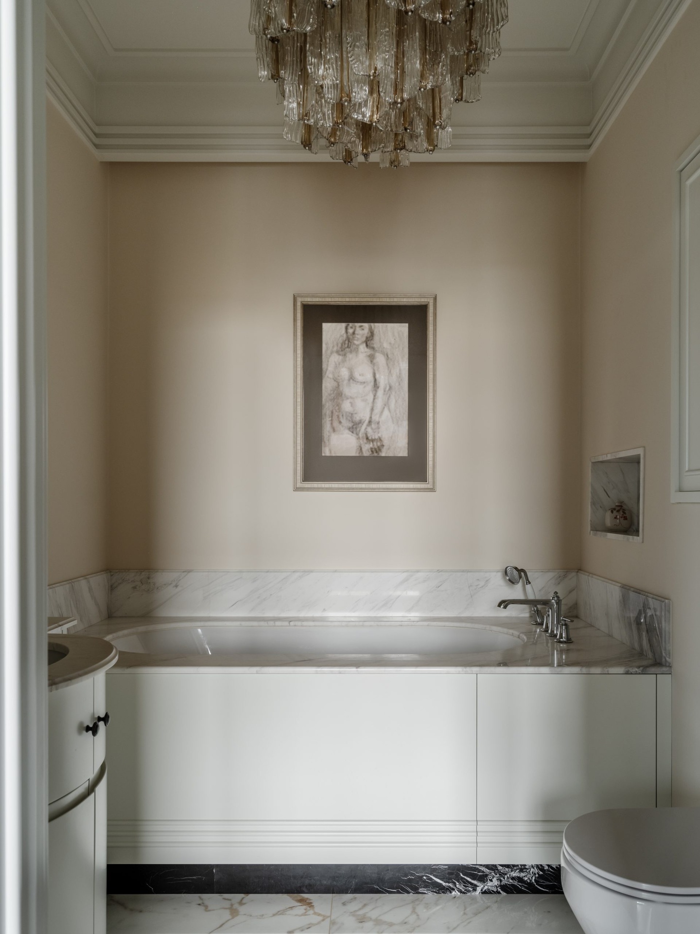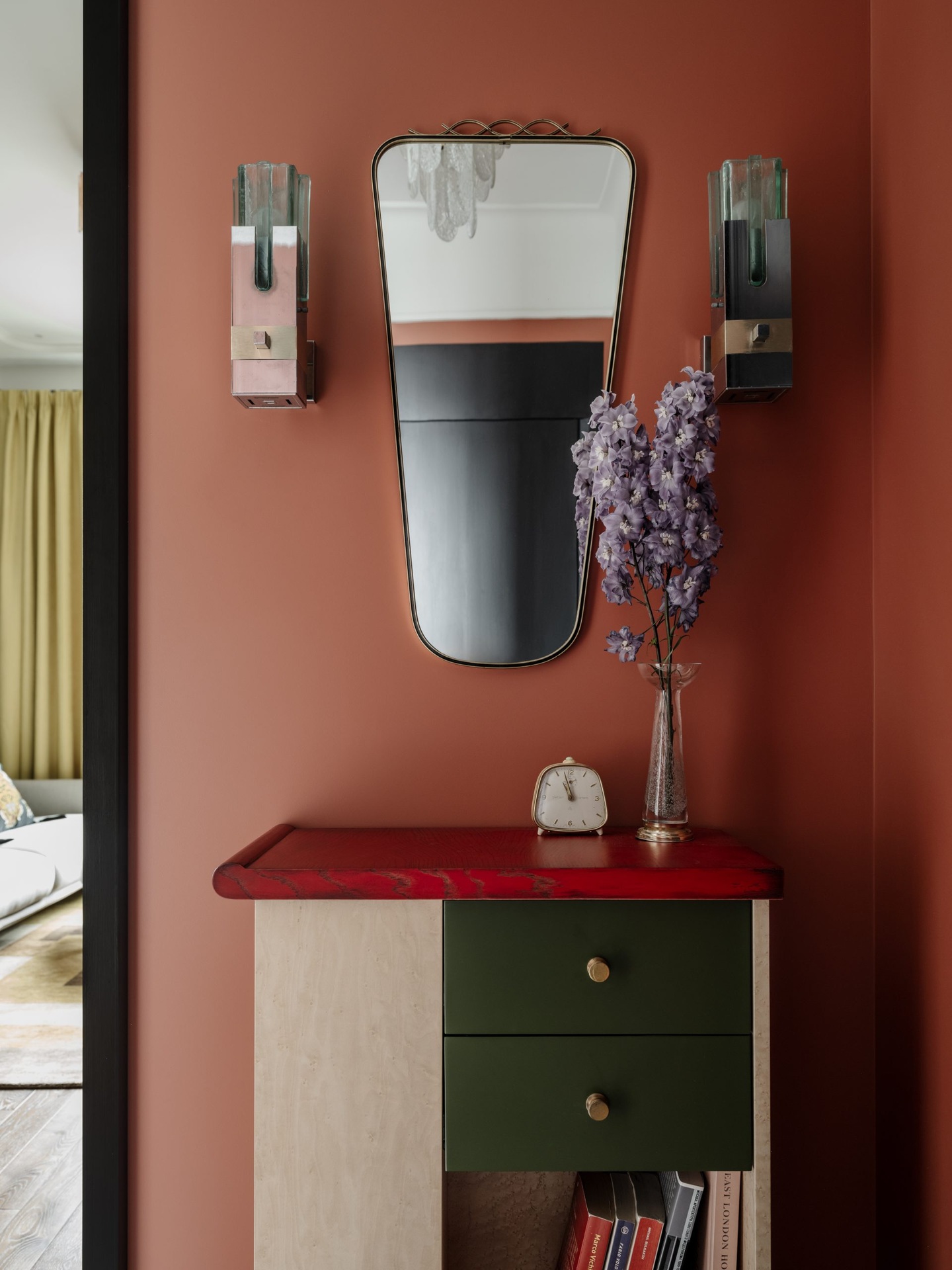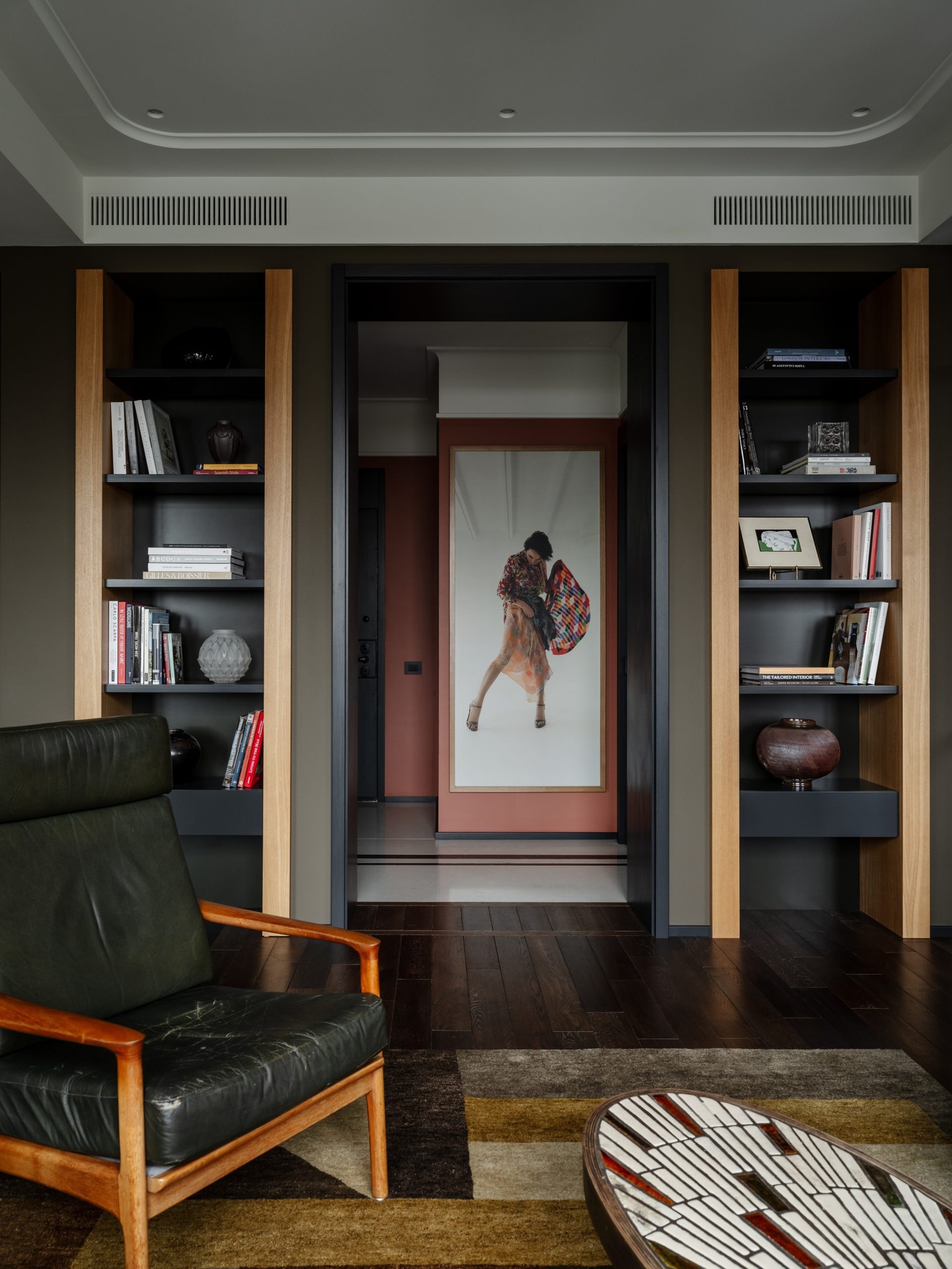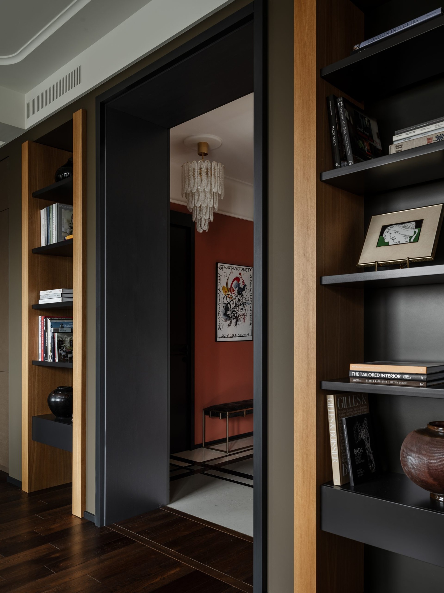 Ez a 68 m²-es lakás a férfias elegánanciát és az időtlen életstílust ünnepli. A nagy ablakokon át rengeteg természetes fény jut be a térbe, ezért nem féltek sötét színeket használni a berendezéshez. A tulajdonos nagy figyelmet fordított a kortárs dekoráció minden egyes részletére az egyedi vintage bútoroktól egészen az olyan anyagokig, mint például a bejáratnál található márványpadló. A lakás két fő részből áll: egy nappali-konyhából és egy hálószobából fürdőszoba kapcsolattal. Ezeket a tereket egy fekete acélból készült, üvegezett térelválasztó választja el, amely teljesen elhúzható függönyökkel is elzárható a nagyobb intimitás érdekében. A színpaletta klasszikusan fehér a mennyezeteknél, de egy meleg fahéjszín kiegészíti, hogy valódi személyiséget adjon a helyiségeknek.