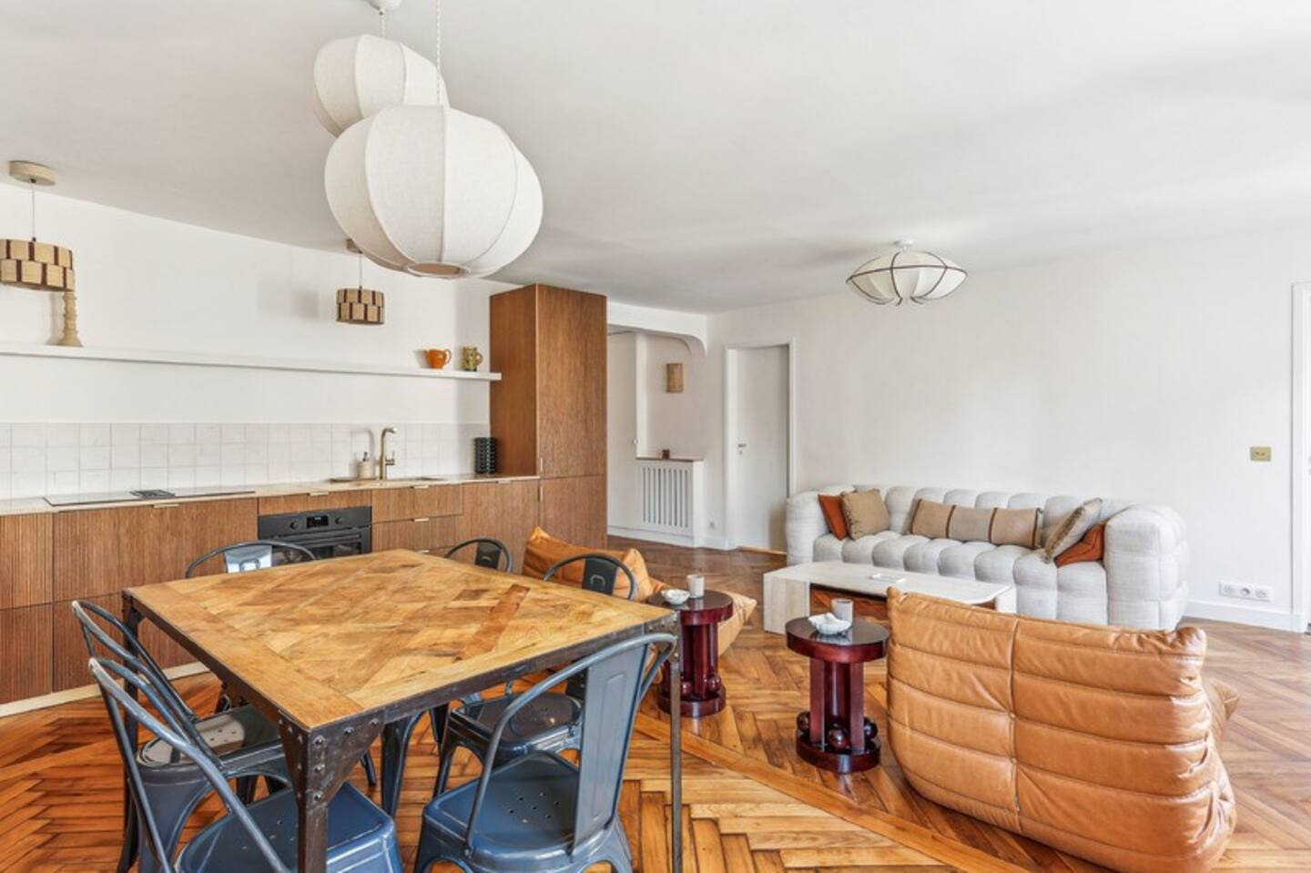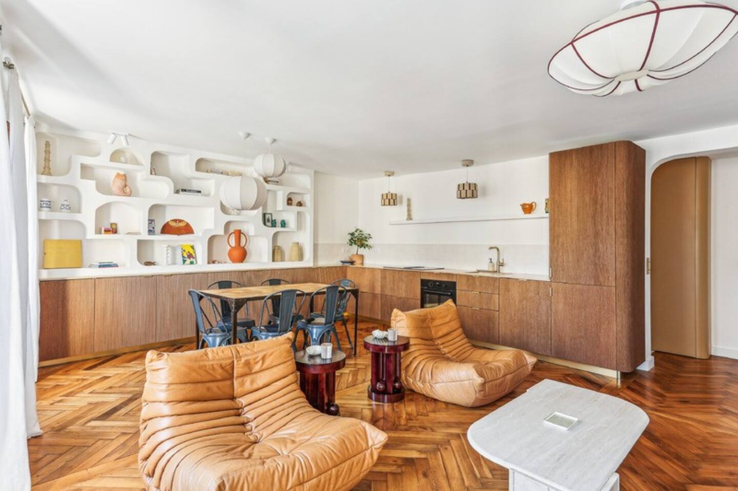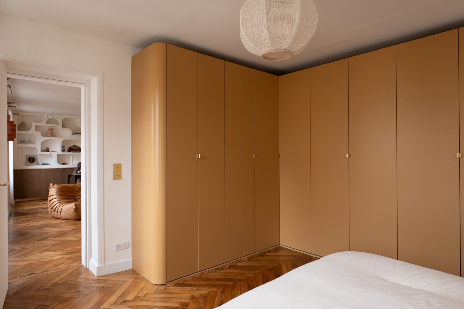 A Bocklip márka a bútorok testreszabására specializálódott, például az IKEA konyhabútorok felújítására, átalakítására. Ennek a lakásnak a tulajdonosai egy Arabica pliszírozott fa felületű frontot választottak az IKEA konyhájukhoz, valamint egy travertin munkalapot, hogy a tágas konyha-nappali egyedi megjelenést kapjon. A klasszikus 85 m²-es lakás két nagy hálószobával rendelkezik, amelyekben visszafogott curry és barna árnyalatokat választottak. Az eredeti parketta, a falba épített könyvespolc és a Togo fotelek hozzájárulnak a szépség és kényelem érzéséhez. A falba épített, egyedi könyvespolcot a konyha kiterjesztéseként tervezték meg, így tárolóhelyet biztosít a szakácskönyveknek és dekorációs tárgyaknak. A tulajdonos egy PAX szekrényt is felöltöztetett Bocklip frontokkal, hogy egy személyre szabott, curry színű, matt lakkal borított szekrényt kapjon, ami stílusában jobban illik a lakás beredenzéséhez.