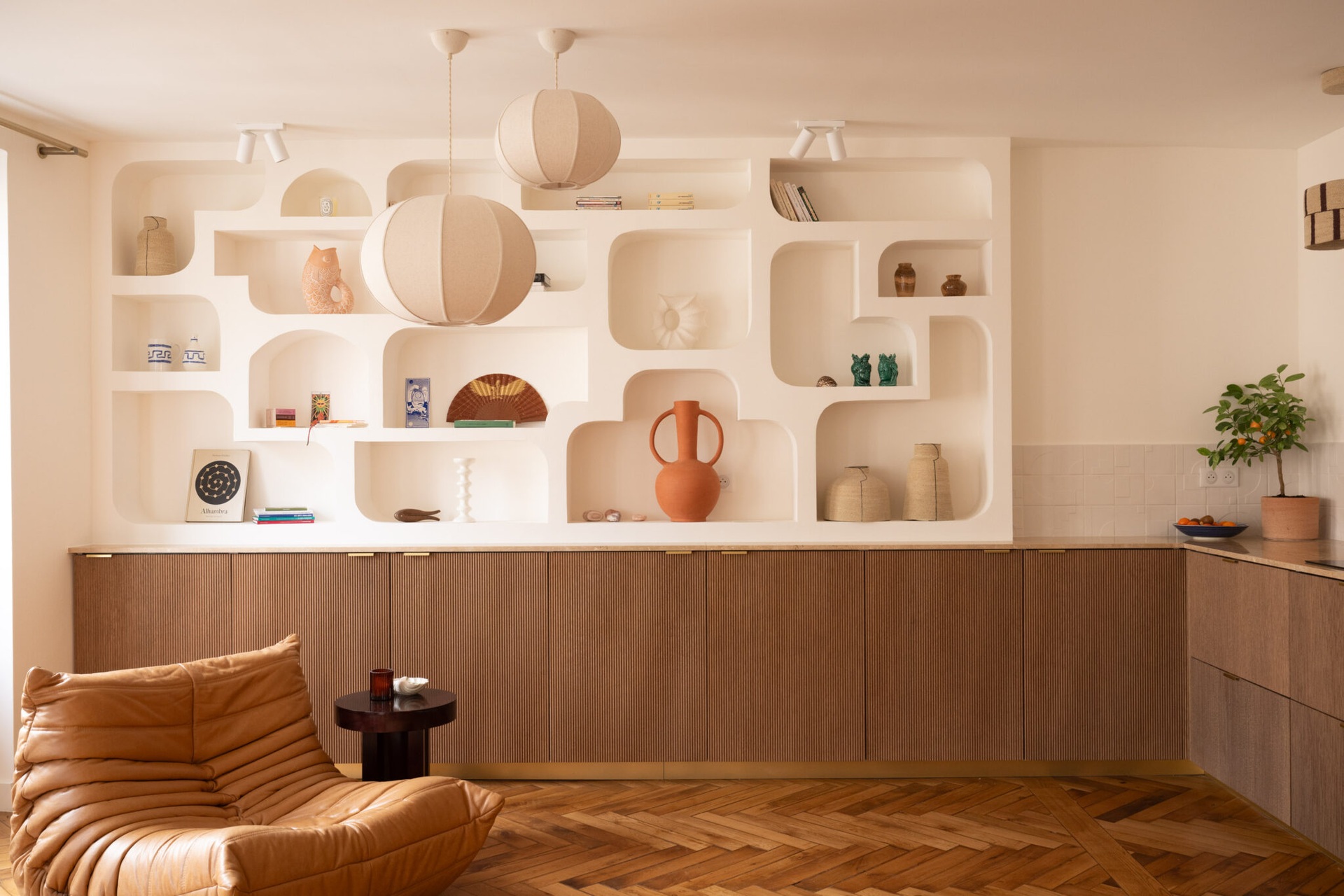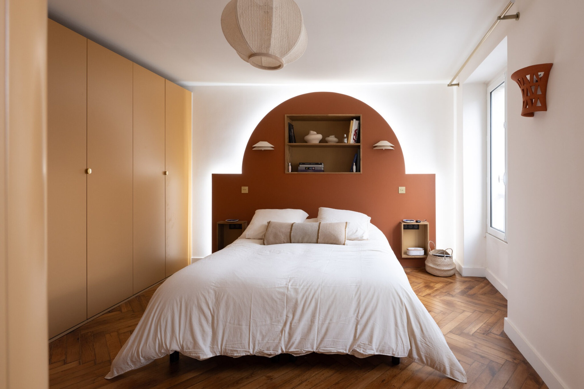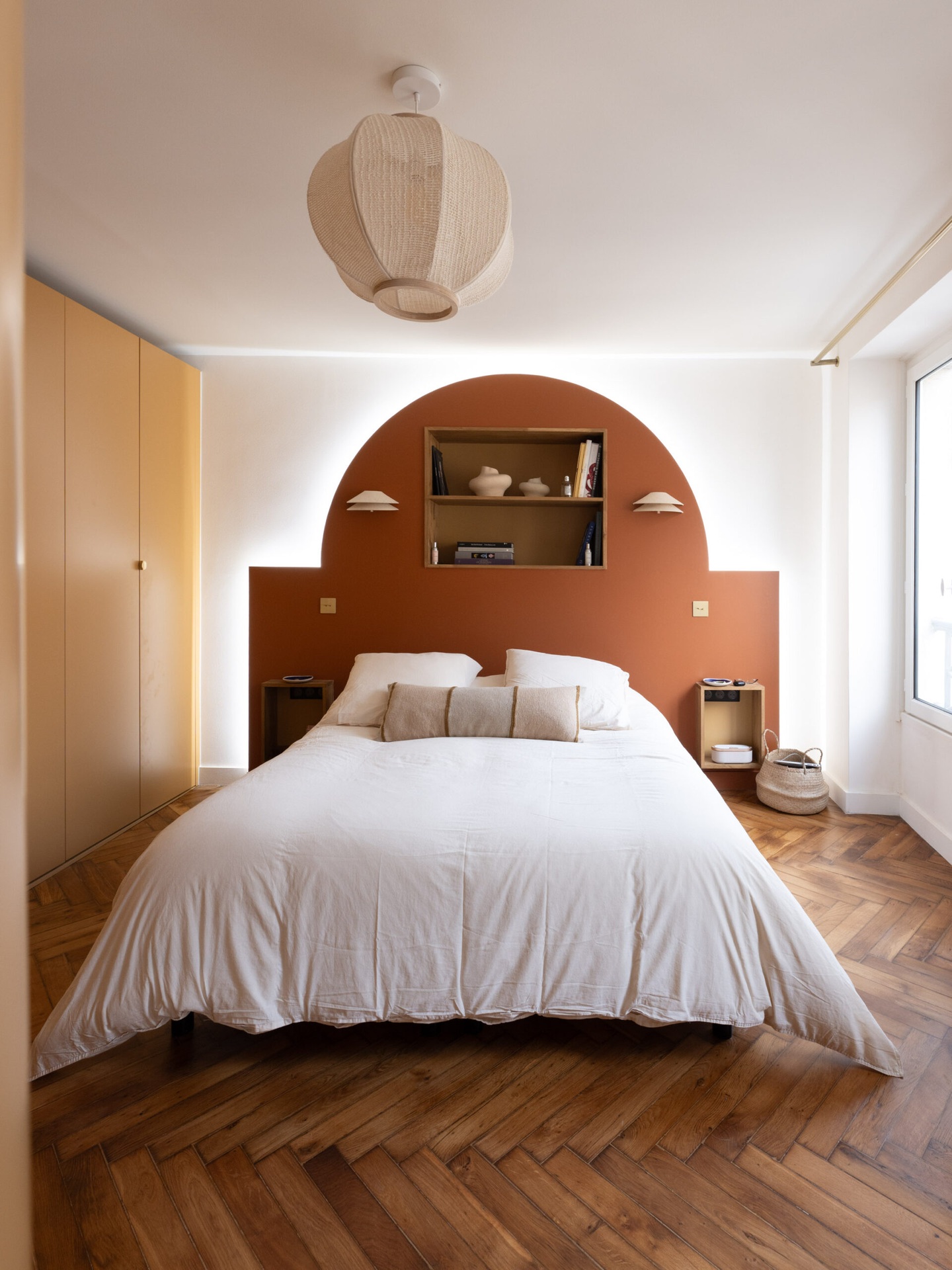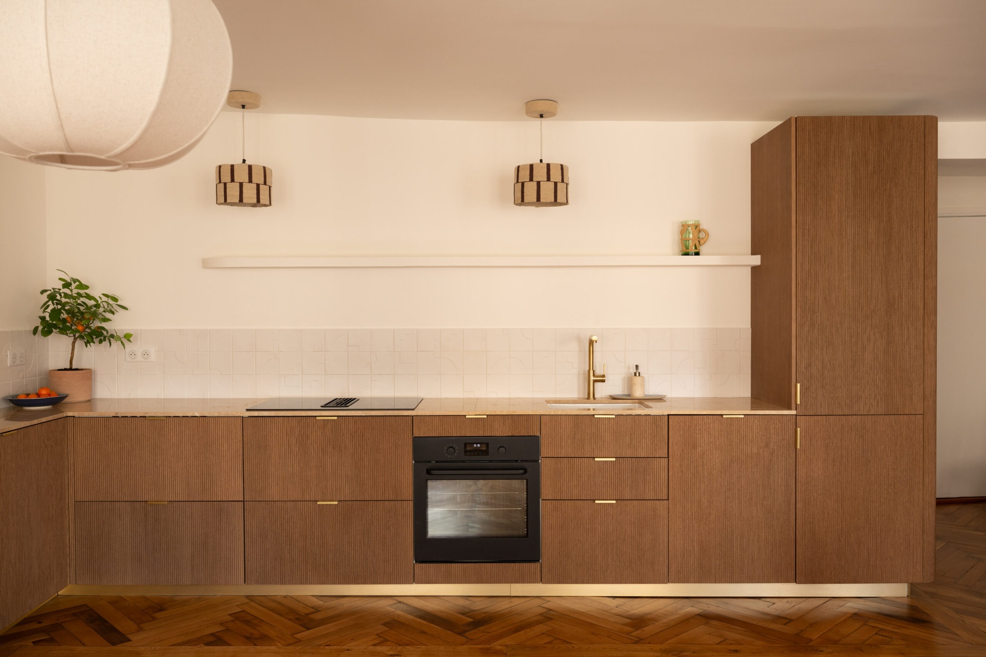 A Bocklip márka a bútorok testreszabására specializálódott, például az IKEA konyhabútorok felújítására, átalakítására. Ennek a lakásnak a tulajdonosai egy Arabica pliszírozott fa felületű frontot választottak az IKEA konyhájukhoz, valamint egy travertin munkalapot, hogy a tágas konyha-nappali egyedi megjelenést kapjon. A klasszikus 85 m²-es lakás két nagy hálószobával rendelkezik, amelyekben visszafogott curry és barna árnyalatokat választottak. Az eredeti parketta, a falba épített könyvespolc és a Togo fotelek hozzájárulnak a szépség és kényelem érzéséhez. A falba épített, egyedi könyvespolcot a konyha kiterjesztéseként tervezték meg, így tárolóhelyet biztosít a szakácskönyveknek és dekorációs tárgyaknak. A tulajdonos egy PAX szekrényt is felöltöztetett Bocklip frontokkal, hogy egy személyre szabott, curry színű, matt lakkal borított szekrényt kapjon, ami stílusában jobban illik a lakás beredenzéséhez.