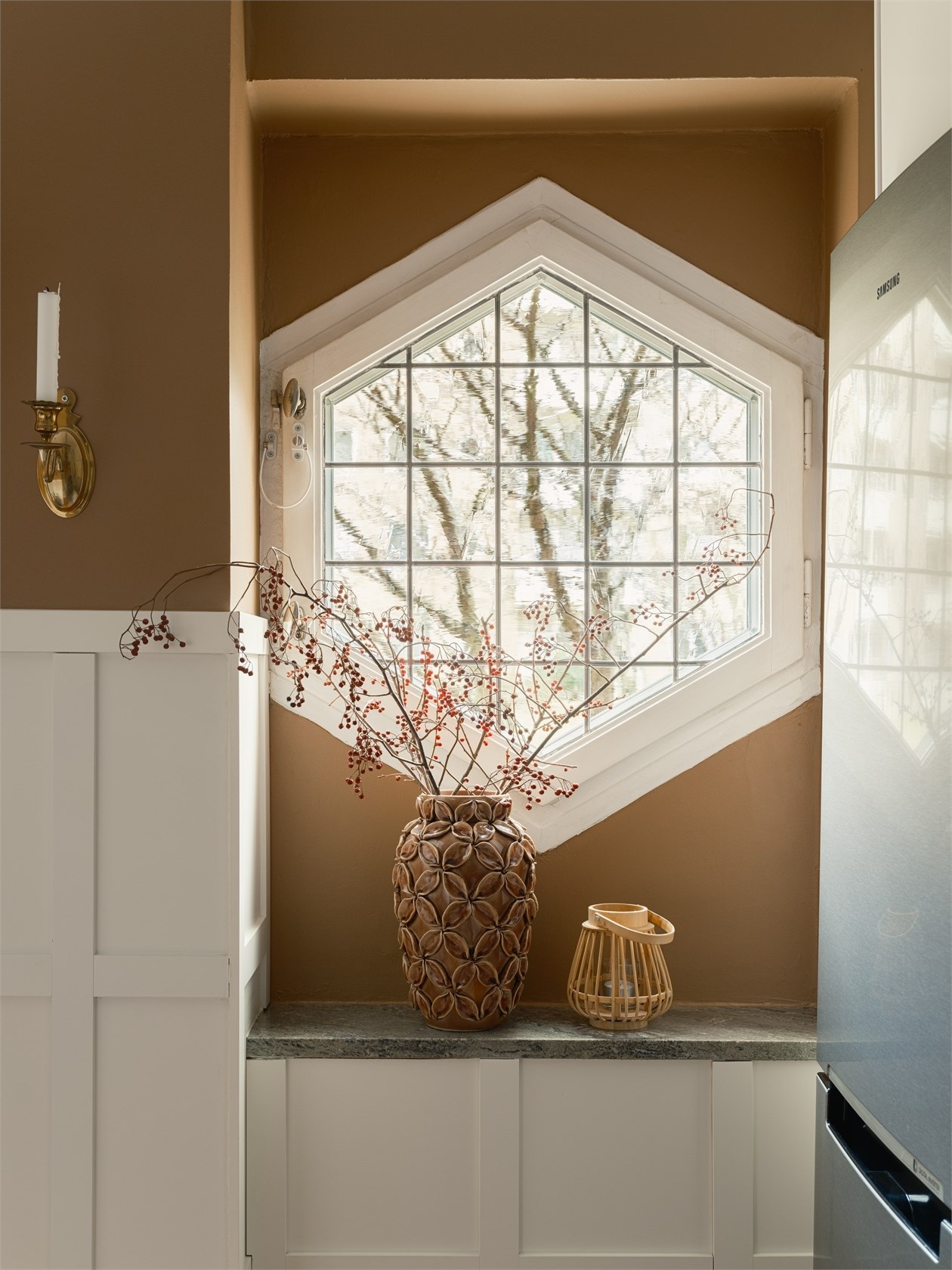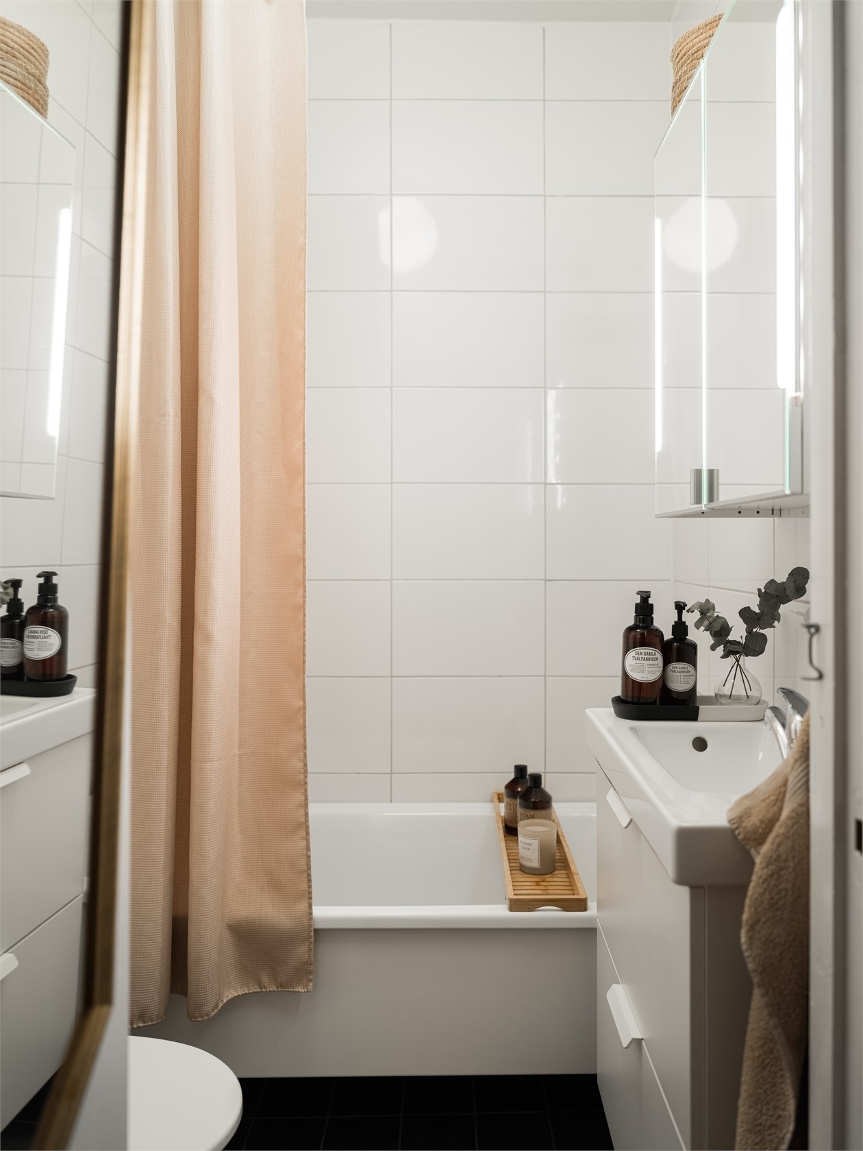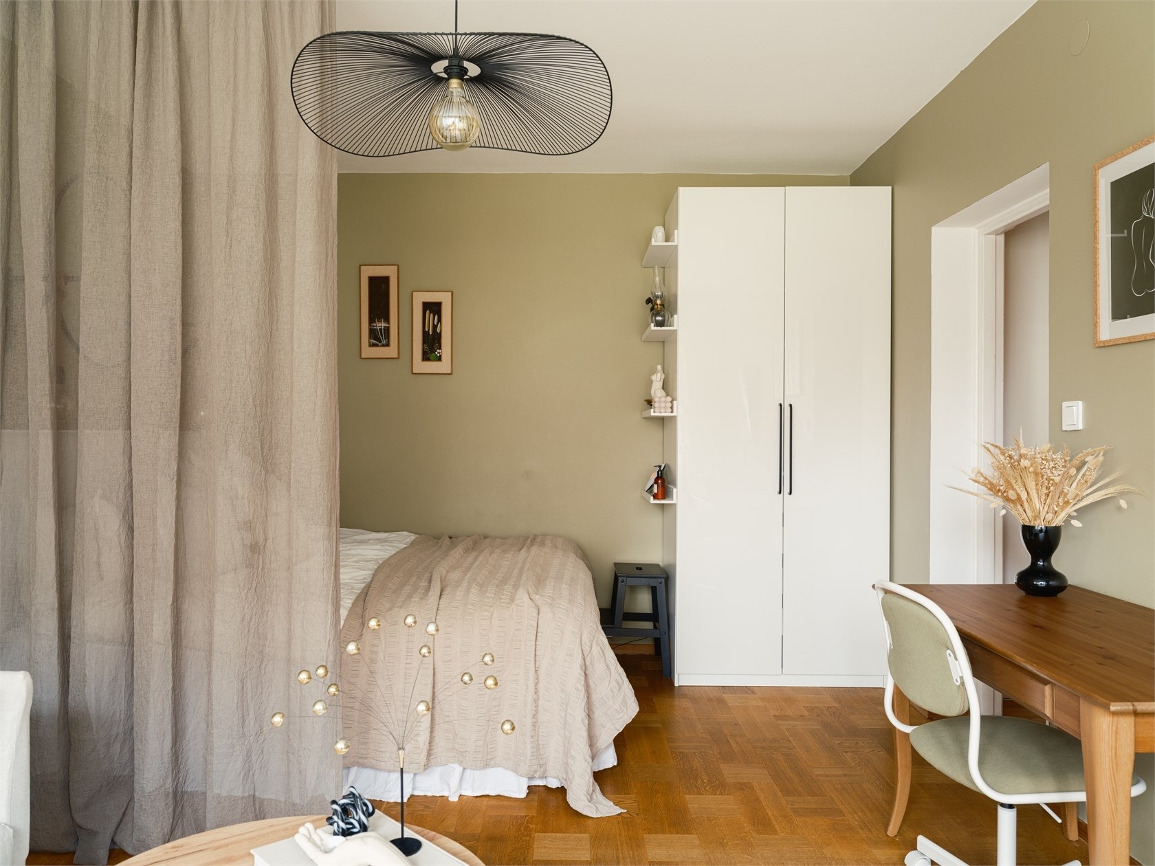 Nem szükséges kék vagy zöld árnyalatokat választani vagy driftwood tárgyakat és hajómodelleket felhalmozni ahhoz, hogy egy, a tengertől nem messze lévő lakást berendezzünk. Ebben a 43 m²-es stúdióban a lágy, semleges színek (kivéve az előszobában) áthatják a teret és megnyugtató légkört teremtenek. Érdemes megemlíteni, hogy viszonylag egyszerű lett volna áthelyezni a konyhát a nappaliba, hogy valódi egy hálószobás lakássá alakítsák át a tágas teret. Azonban a tulajdonosok inkább a főhelyiségben helyezték el a hálórészt, amelyet egy függönnyel rejtettek el. Ez kétségkívül olcsóbb megoldás, mint a nagyobb átalakítási munkák. A stúdió egy, a múlt század közepén épült házban található és van néhány szép jellemzője, mint például a konyhában lévő kisablak. A világos és sötétebb árnyalatok közötti kontraszt igazi személyiséget ad a lakásnak, bár arra ügyeltek, hogy minden színárnyalat az okkersárga és bézs közötti színskálából legyen kiválasztva, biztosítva ezzel a tökéletes harmónia érzését.