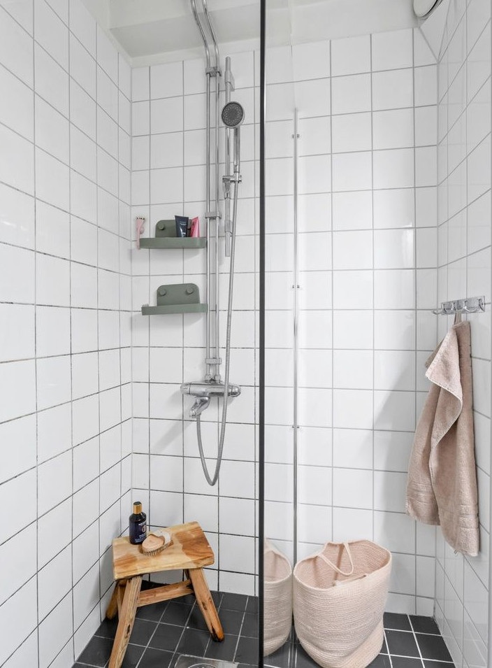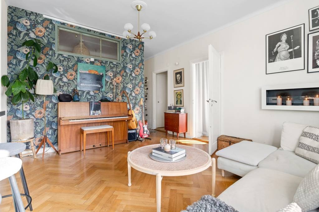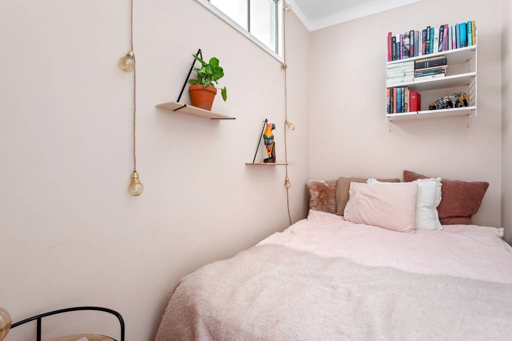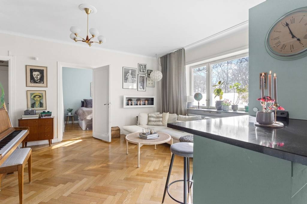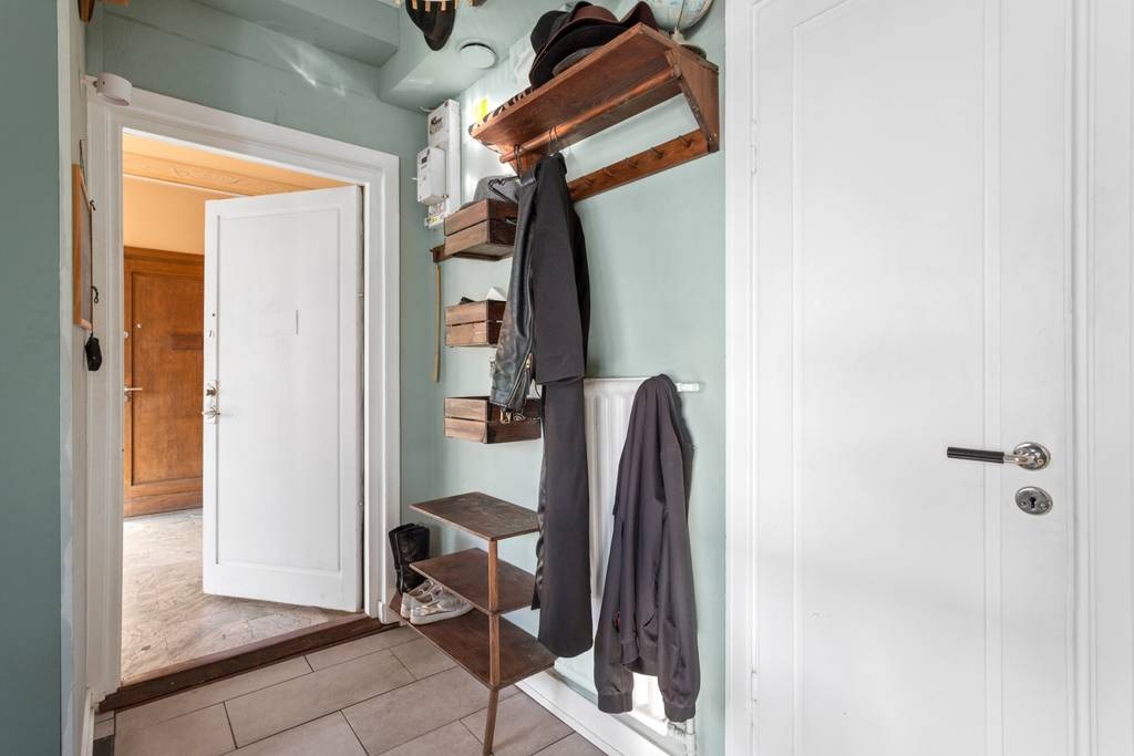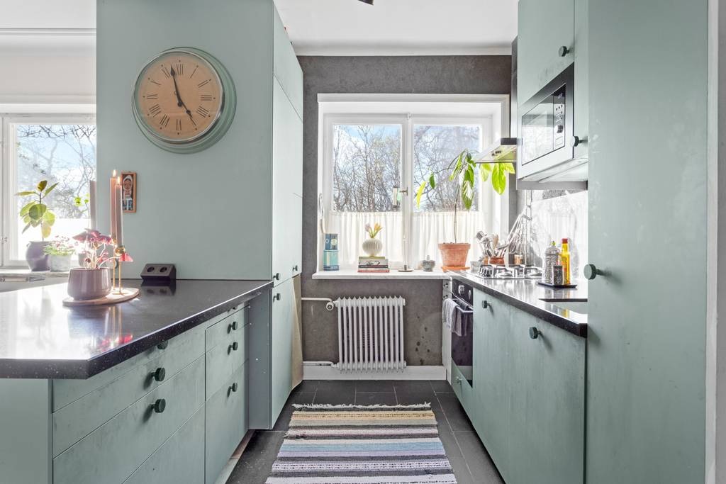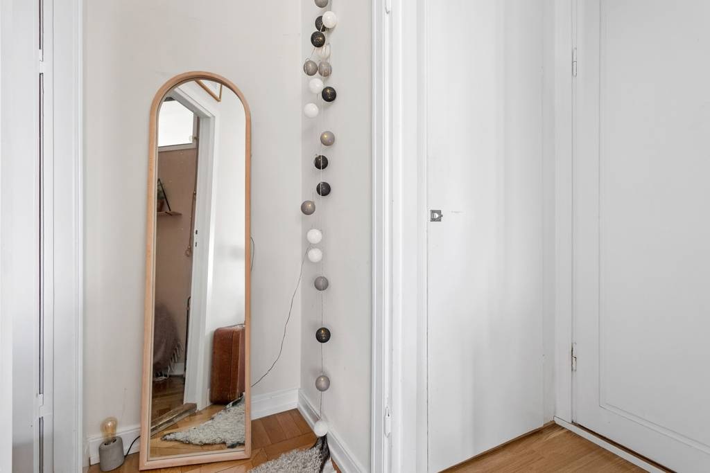 Extra helyet teremteni egy kis lakásban nem mindig egyszerű feladat. Ebben az esetben azonban sikerült kihasználni a korábban tárolásra szolgáló felső teret. Egy másodlagos fényt biztosító ablak beépítésével egy emelt hálószobát alakítottak ki a vendégek számára. A fő hálószoba a lakás hátsó részében található. A dekoráció is külön figyelmet érdemel: zöld árnyalatok dominálnak, amelyek visszaköszönnek a nyitott konyha bútorzatában és a tapéta mintáiban is. Gyönyörűen harmonizál a halszálkamintás parkettával.