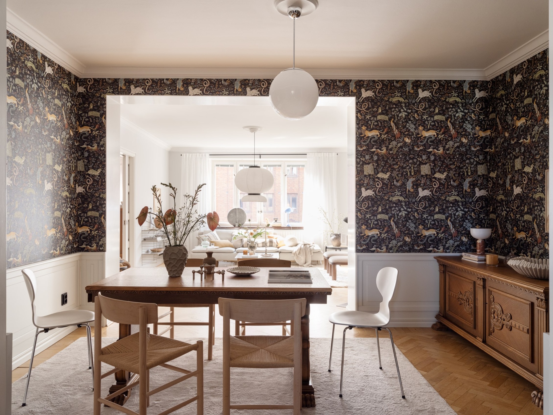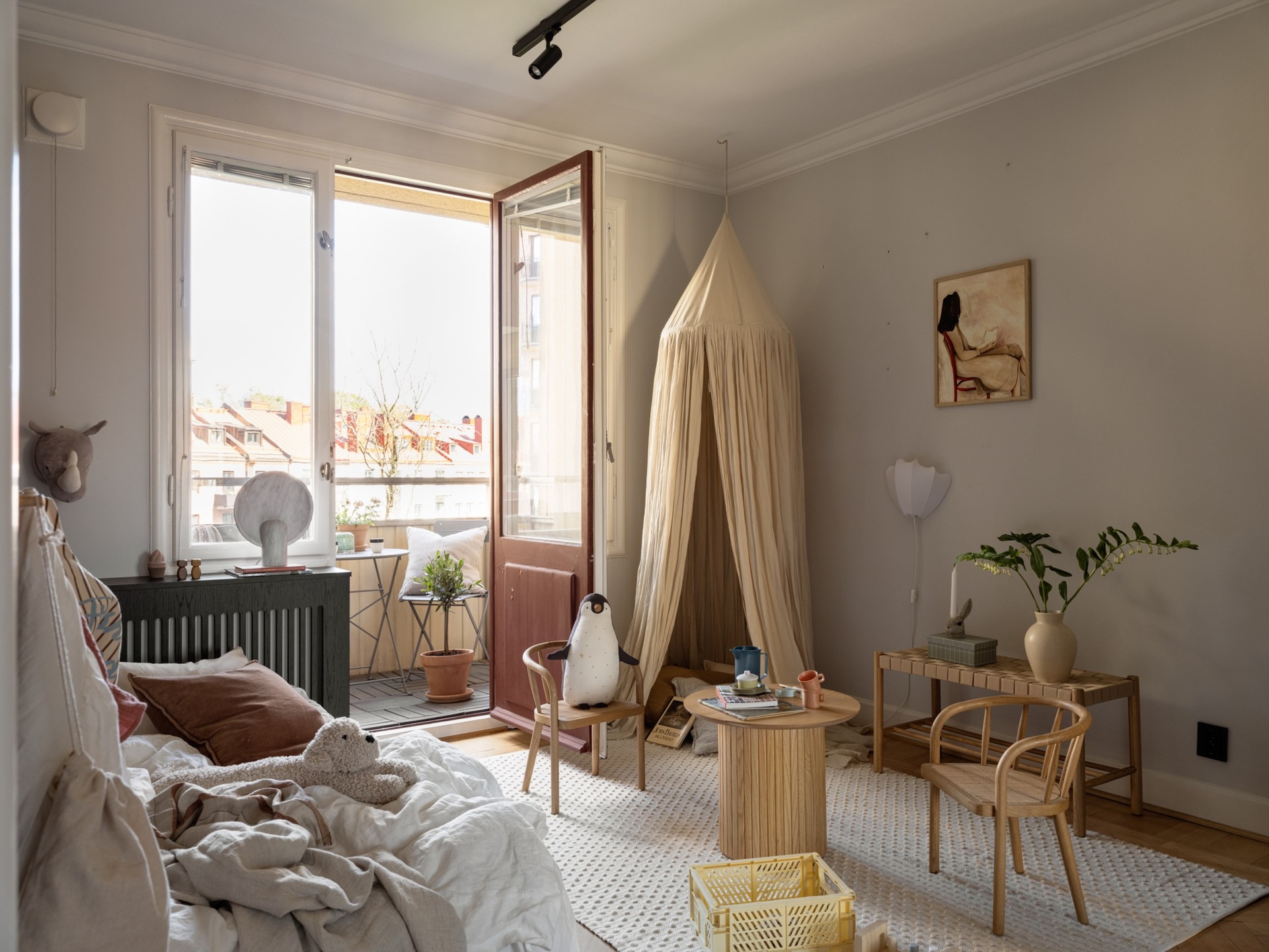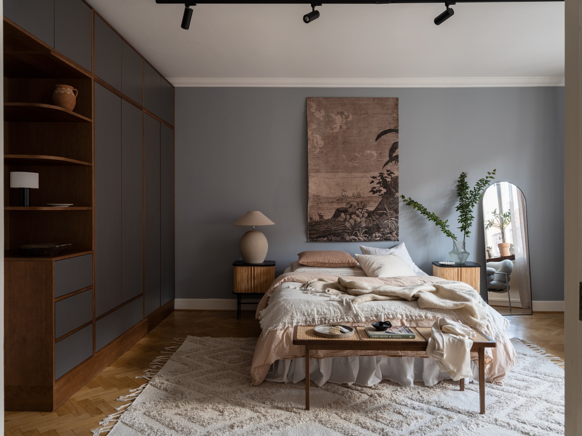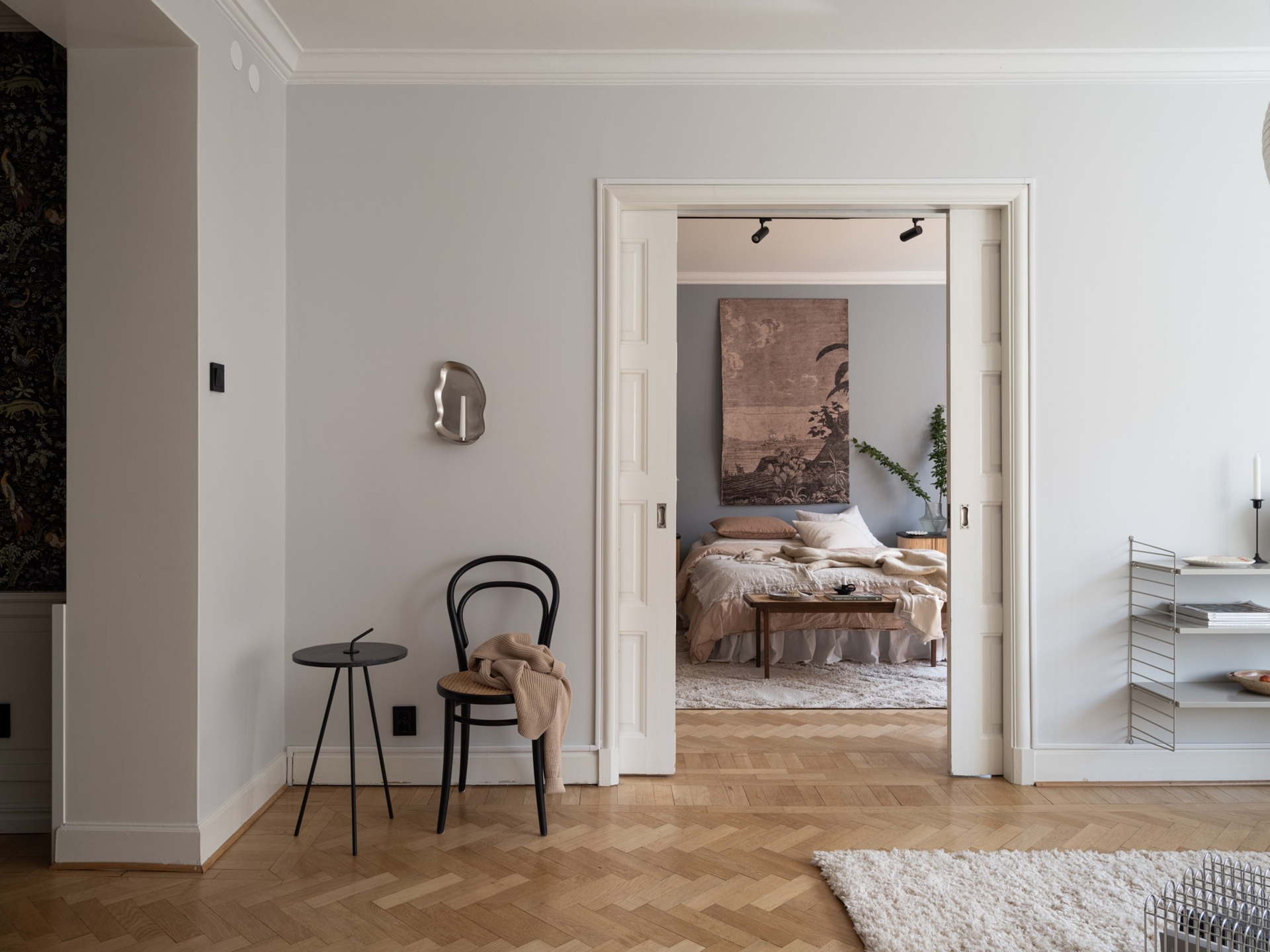 Egy klasszikus svéd otthon, ahol a kék és barna finom árnyalatai lágyítják a tiszta fehér falak eleganciáját. Az 1930-as évekből származó épület romantikus skandináv stílusa a századfordulós belmagassággal és a halszálka parketta időtlen szépségével fonódik össze. A nappali antik kandallója és a harmonikus térszervezés teret ad a meghitt családi pillanatoknak és a baráti összejöveteleknek egyaránt. A fő hálószoba visszafogott, nyugodt tónusai, valamint a karakteres tapéták egyediséget kölcsönöznek az enteriőrnek. A gyerekszoba játékos, világos és barátságos, ahol a funkcionalitás és a kreativitás egyaránt helyet kapott, így igazán otthonos teret kínál a kicsiknek. A modern Formakami lámpa és a család örökölt, tömörfa bútorai szerves részei ennek a kifinomult összhangnak, amely valódi otthonná varázsolja a 111 négyzetmétert.