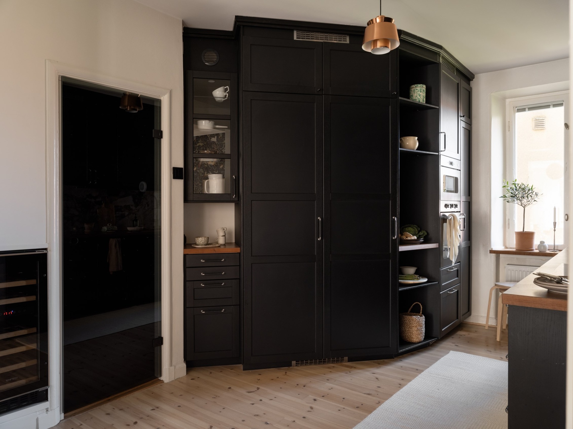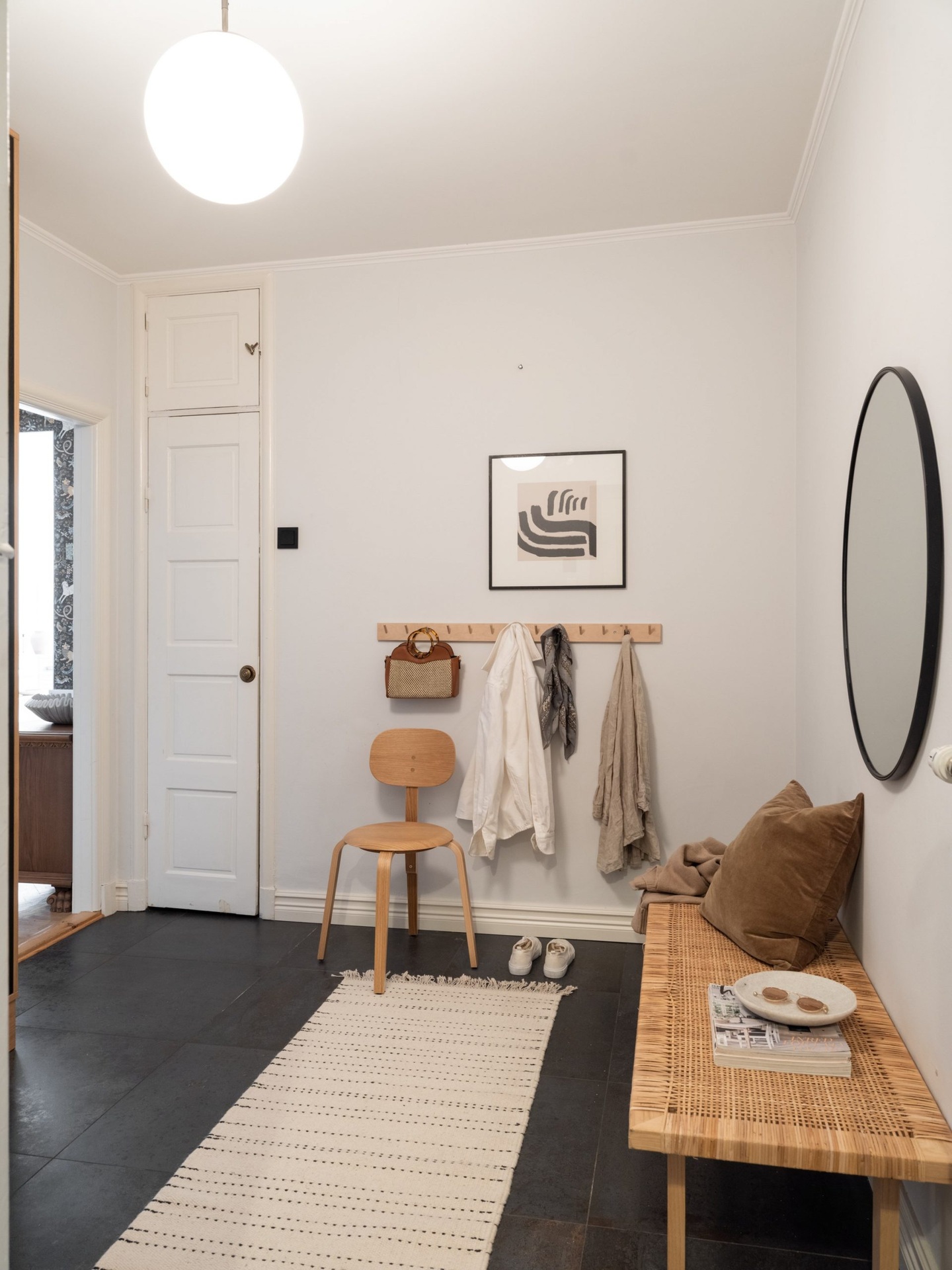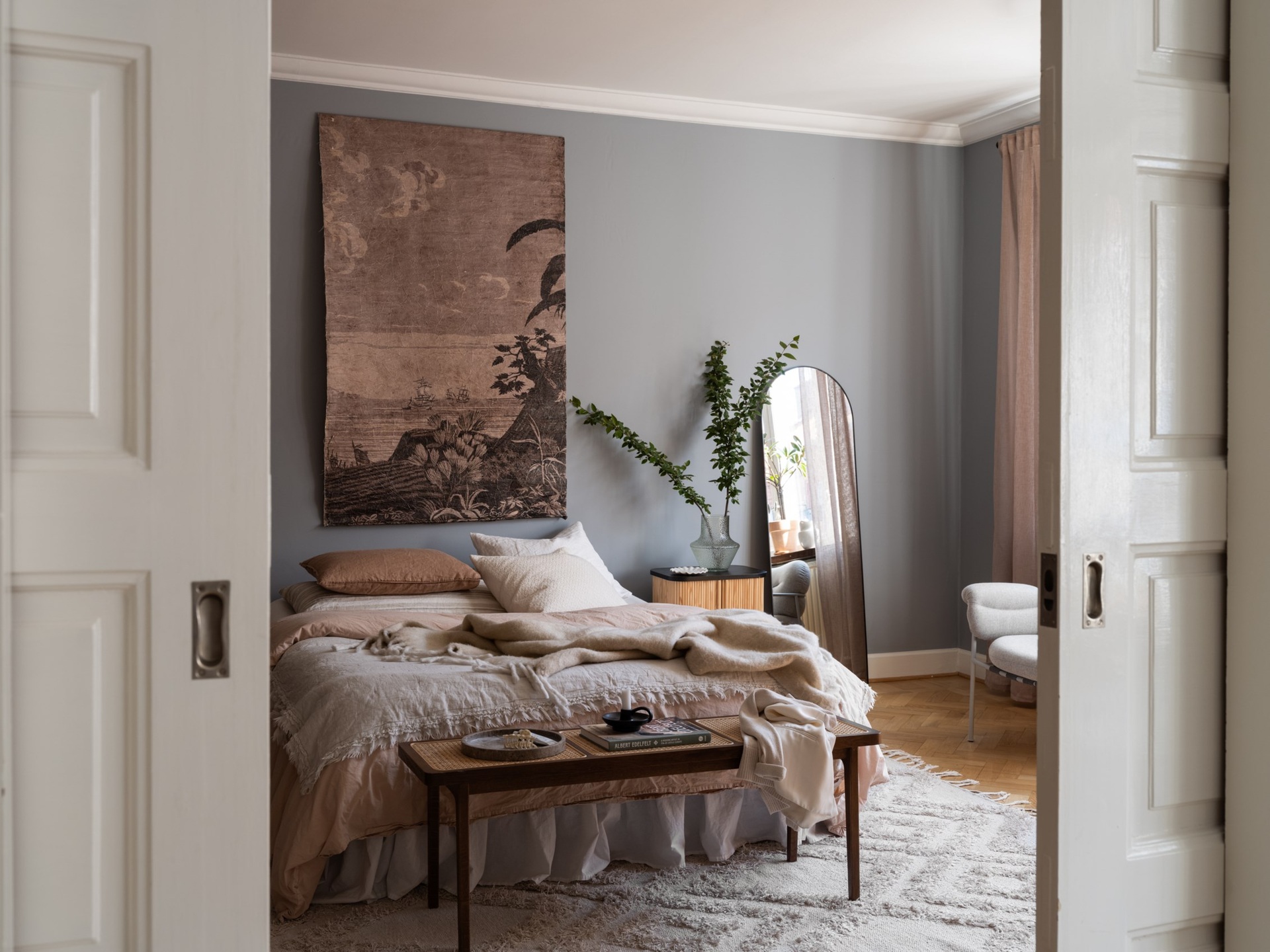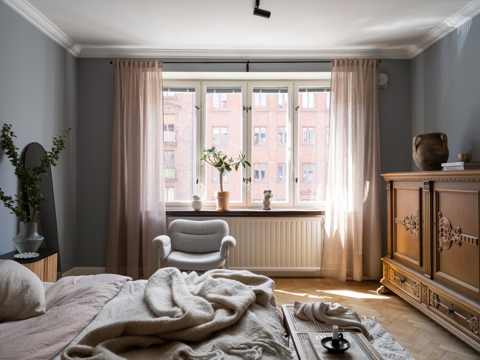 Egy klasszikus svéd otthon, ahol a kék és barna finom árnyalatai lágyítják a tiszta fehér falak eleganciáját. Az 1930-as évekből származó épület romantikus skandináv stílusa a századfordulós belmagassággal és a halszálka parketta időtlen szépségével fonódik össze. A nappali antik kandallója és a harmonikus térszervezés teret ad a meghitt családi pillanatoknak és a baráti összejöveteleknek egyaránt. A fő hálószoba visszafogott, nyugodt tónusai, valamint a karakteres tapéták egyediséget kölcsönöznek az enteriőrnek. A gyerekszoba játékos, világos és barátságos, ahol a funkcionalitás és a kreativitás egyaránt helyet kapott, így igazán otthonos teret kínál a kicsiknek. A modern Formakami lámpa és a család örökölt, tömörfa bútorai szerves részei ennek a kifinomult összhangnak, amely valódi otthonná varázsolja a 111 négyzetmétert.