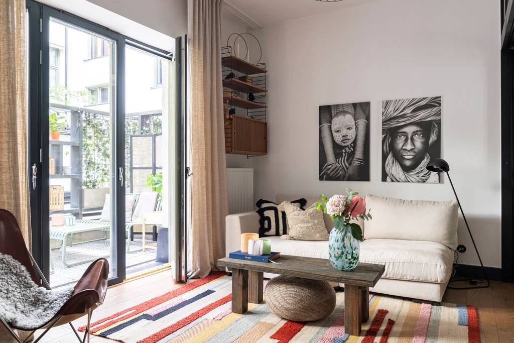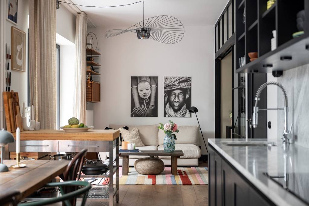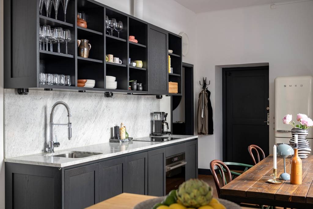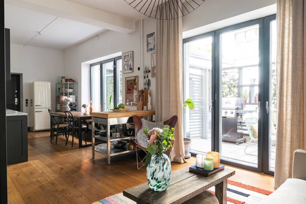 Ez a világos és barátságos, 48 m²-es egyszobás lakás körülbelül 3 méteres belmagassággal rendelkezik. Berendezését letisztult, elegáns megjelenés jellemzi. A sötét, tömör parkettapadló meleg kontrasztot alkot a fehér falakkal, míg a bútorok a rusztikus és ipari stílusokat ötvözik. A nagy ablakokon keresztül egész nap természetes fény világítja meg a lakást, ahol a konyha jelenti a központi találkozóhelyet: tágas Carrarai márvány munkalapokkal és nagy étkezőrésszel, amely ideális a családi vagy baráti vacsorákhoz. A nappaliból nyíló hálórészt egy elegáns, ipari stílusú üvegfal választja el, amely megőrzi a fény útját és karaktert ad a térnek. Szintén a nappaliból nyílik egy tágas terasz, ami harmonikusan követi a belső terek letisztult, visszafogott megjelenését. Remek ötlet a privát szférát nyújtó, nyitott polcrendszer, ami egyszerre praktikus és stílusos darab.