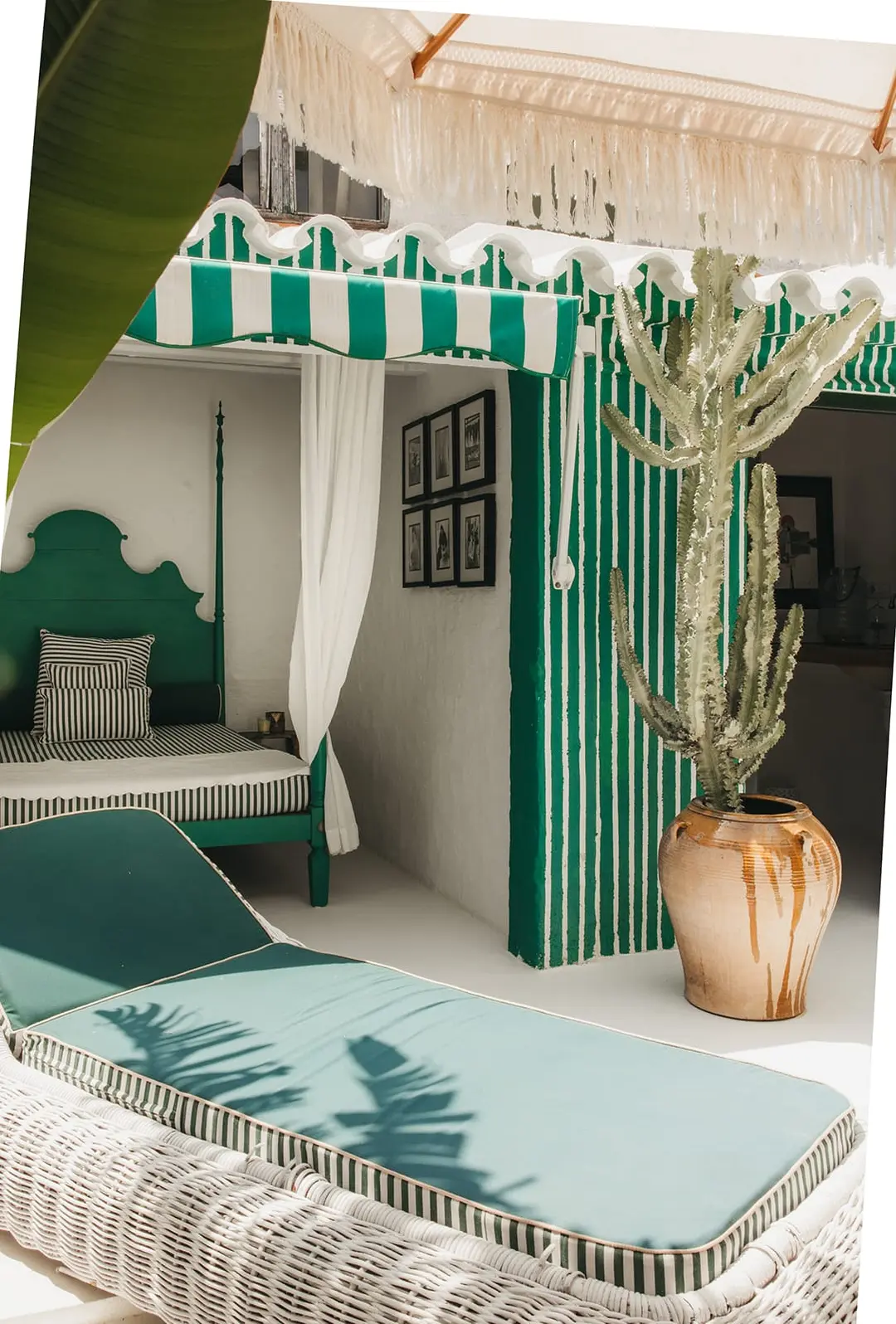 Az alábbi kert és terasz igazi mediterrán menedék: a 150 m²-es trópusi növényzet szelíd ölelésében pihen a medence, amely vizuálisan és hangulatában is kiterjeszti a lakóteret. A nagy, nyitott teraszról egyenesen a medencébe léphetünk, így a kültéri és beltéri terek finoman összefonódnak.