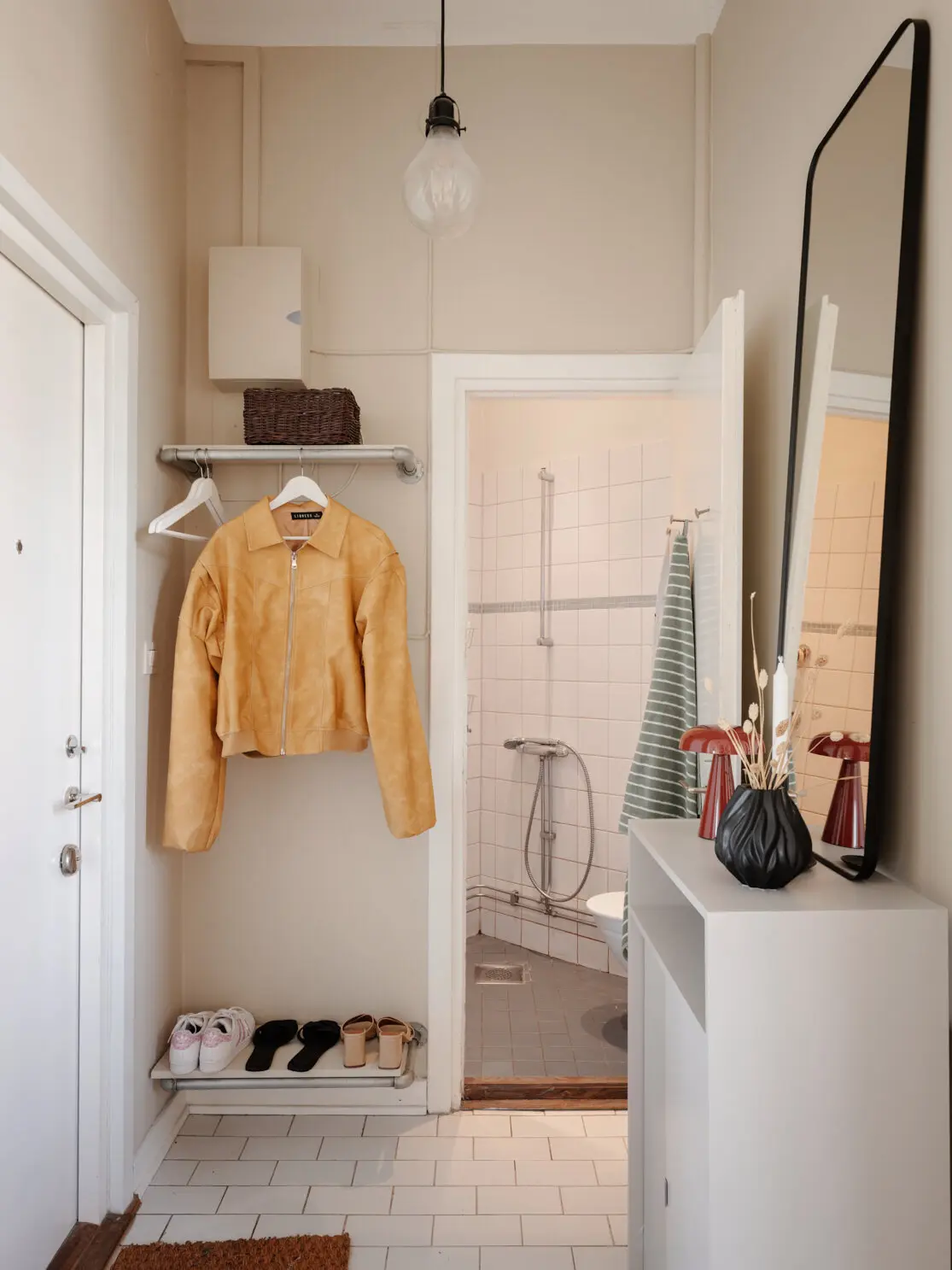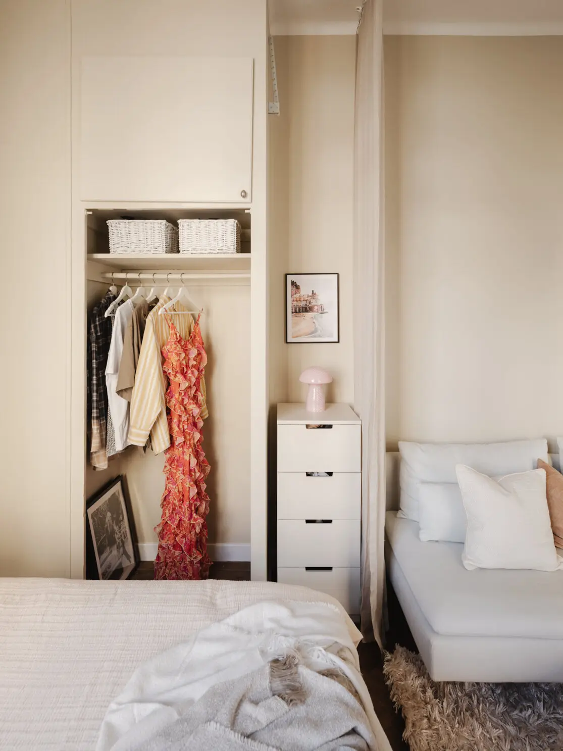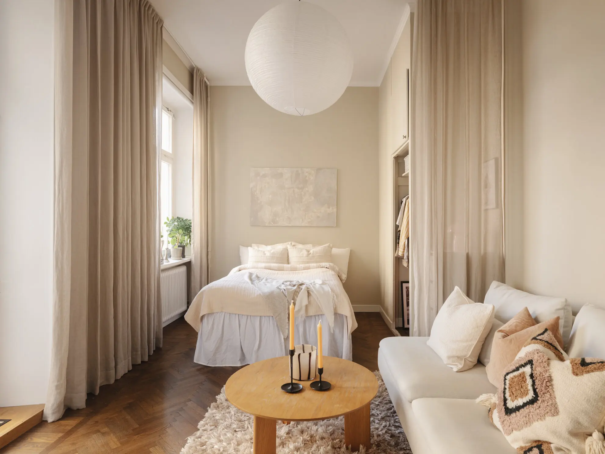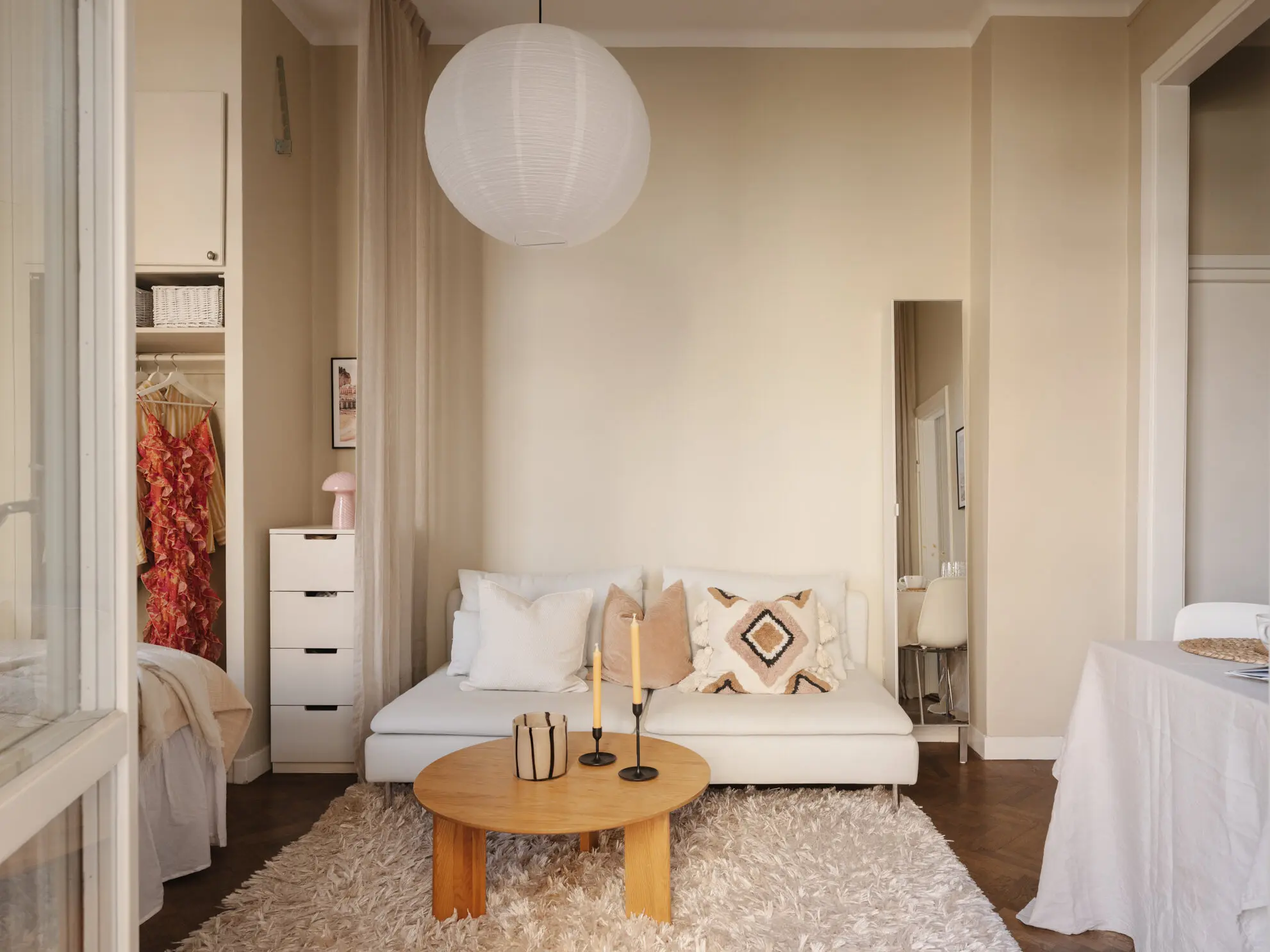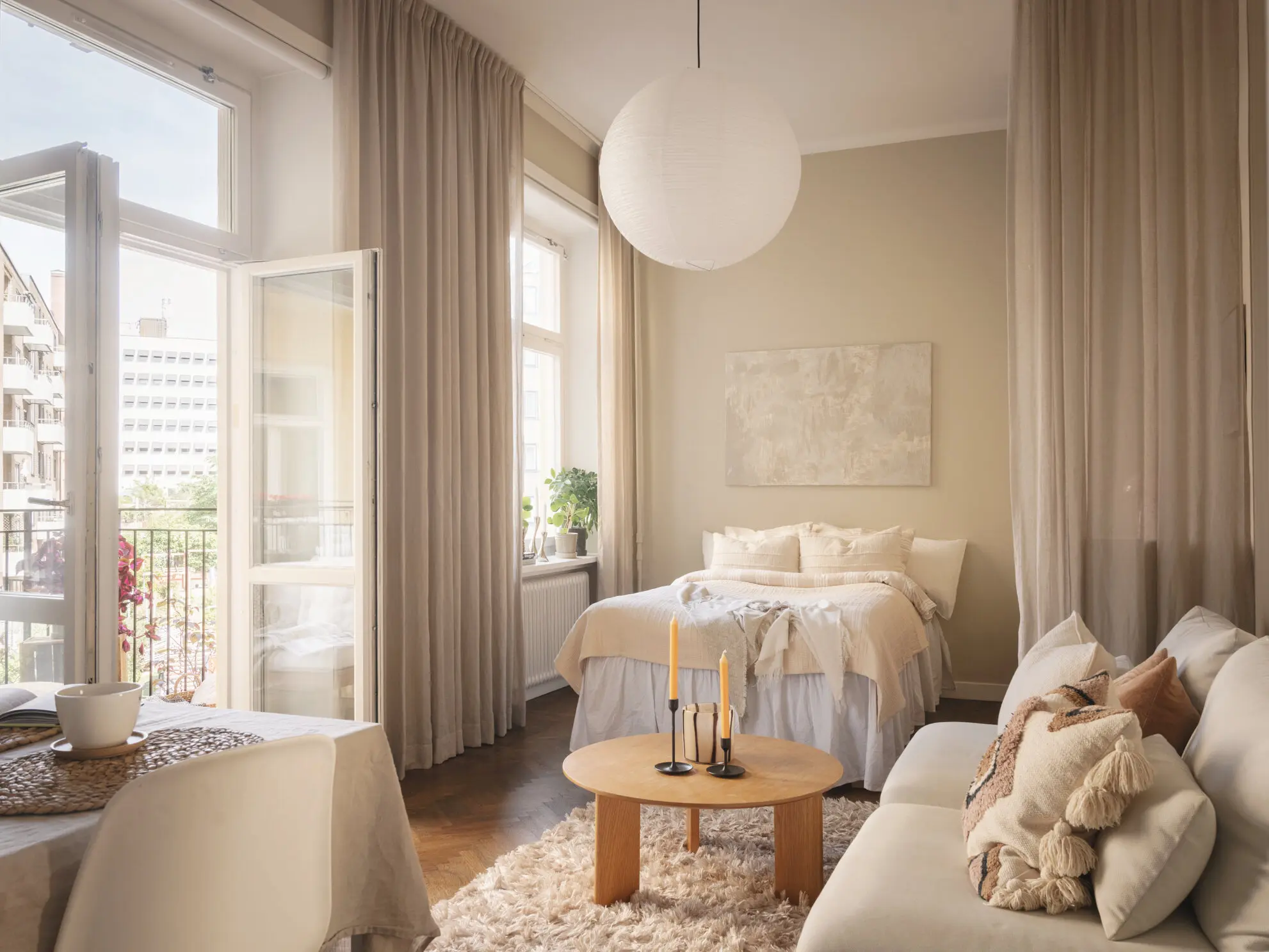 Ez a gondosan felújított, mindössze 24 m²-es garzon a bizonyíték, hogy a kis terek is lehetnek tágasak és elegánsak. A századfordulós épületben található lakás magas belmagassága és nagy ablakai bőséges természetes fényt engednek be, melyet a franciaajtós, belső udvarra néző erkély csak fokoz. A konyha mély, időtlen kékje és a márvány munkalap egyszerre sugároz kifinomult stílust és praktikusságot. Az ágy egy függönnyel leválasztható kuckóban kapott helyet, míg a nappali részben kanapé és étkezőasztal teremti meg az otthonos légkört. Meleg színek, átgondolt tárolási megoldások és a történelmi báj finom találkozása teszi ezt a kis lakást igazán hívogatóvá.