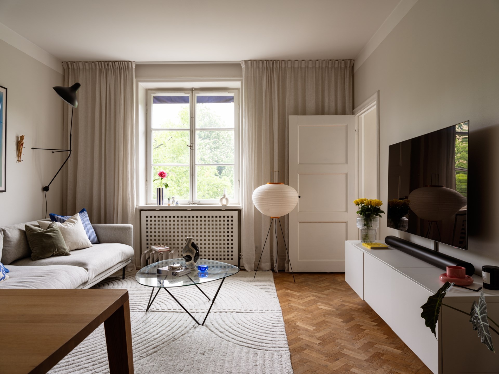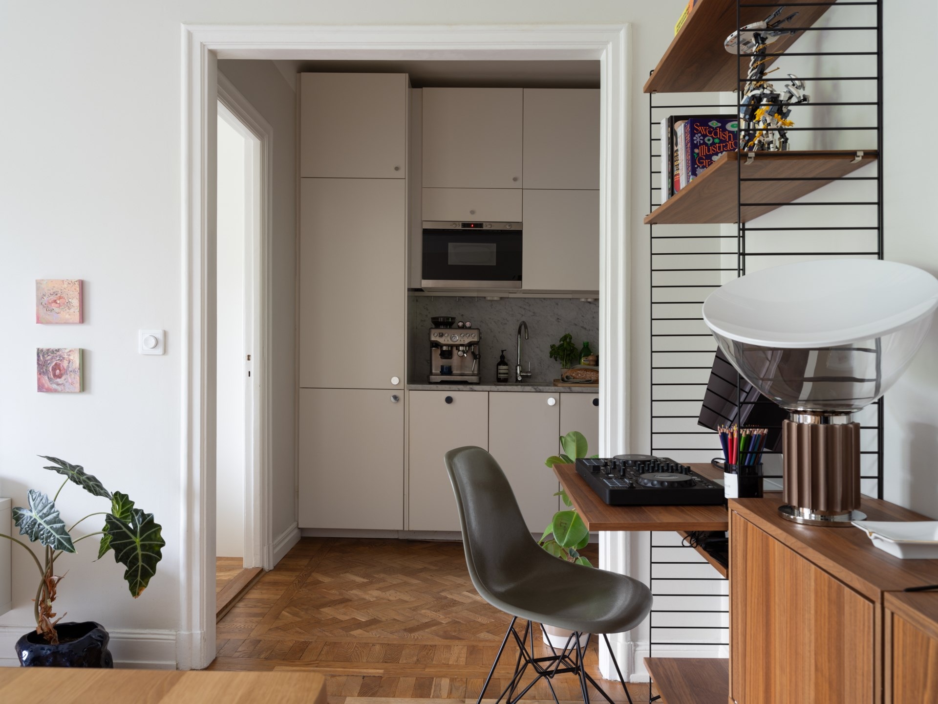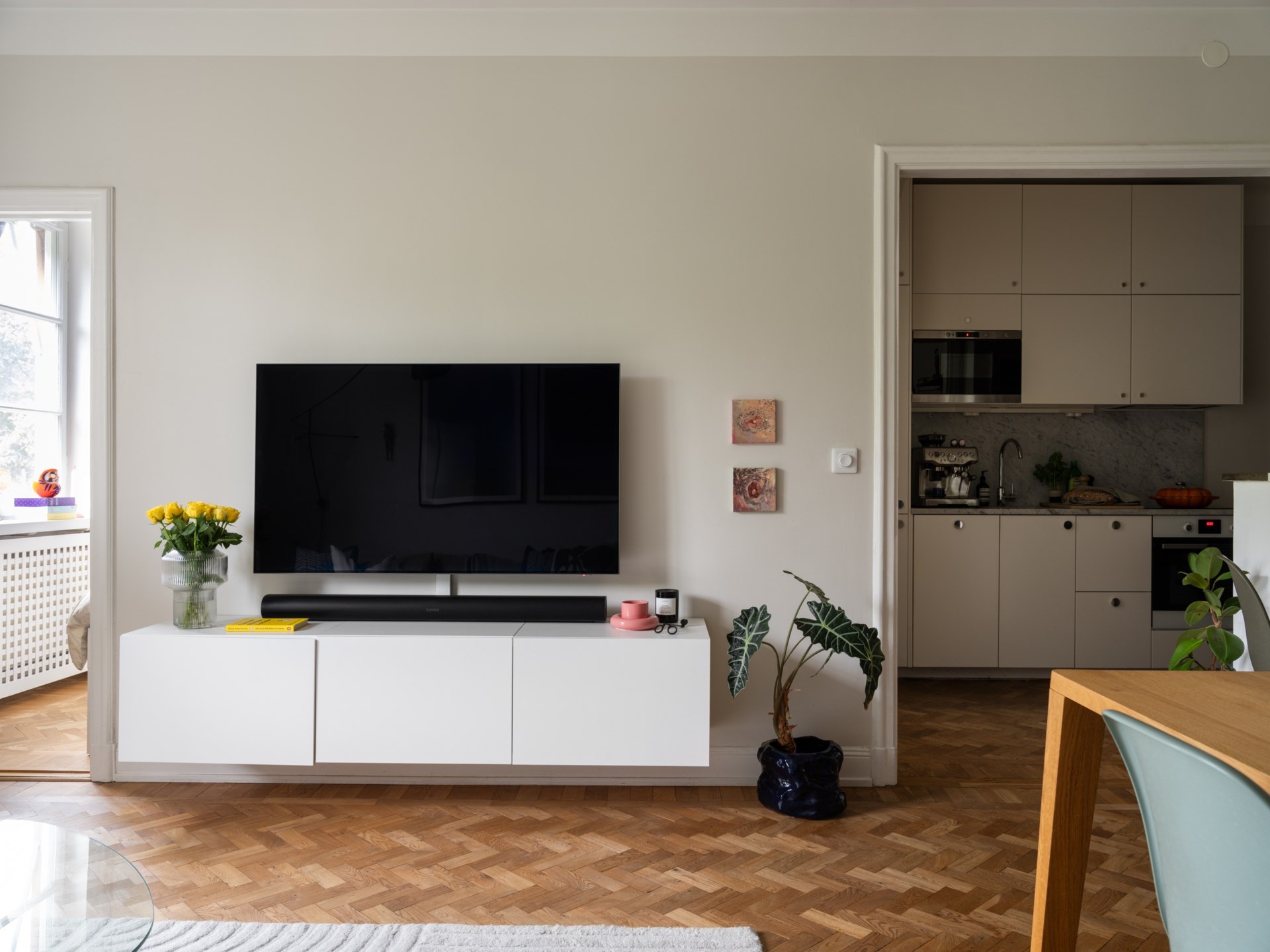 Egy 1920-as évekbeli épületében található ez a 43 m²-es, egy hálószobás lakás, amely a korszak történelmi karakterét ötvözi a kifinomult részletekkel. A mélyen ülő ablakokon beáradó fény a halszálkás parkettán ragyog, míg a magas mennyezetek tágasságot sugallnak. A korábbi előszobából praktikus konyha lett, így a nappaliban elég hely jutott egy étkezőnek és egy stílusosan kialakított dolgozóegységnek is. Az 50–60-as évek hangulatát idéző berendezéshez fehér konyhabútor és márványhatású munkalap társul, kék színfoltokkal.