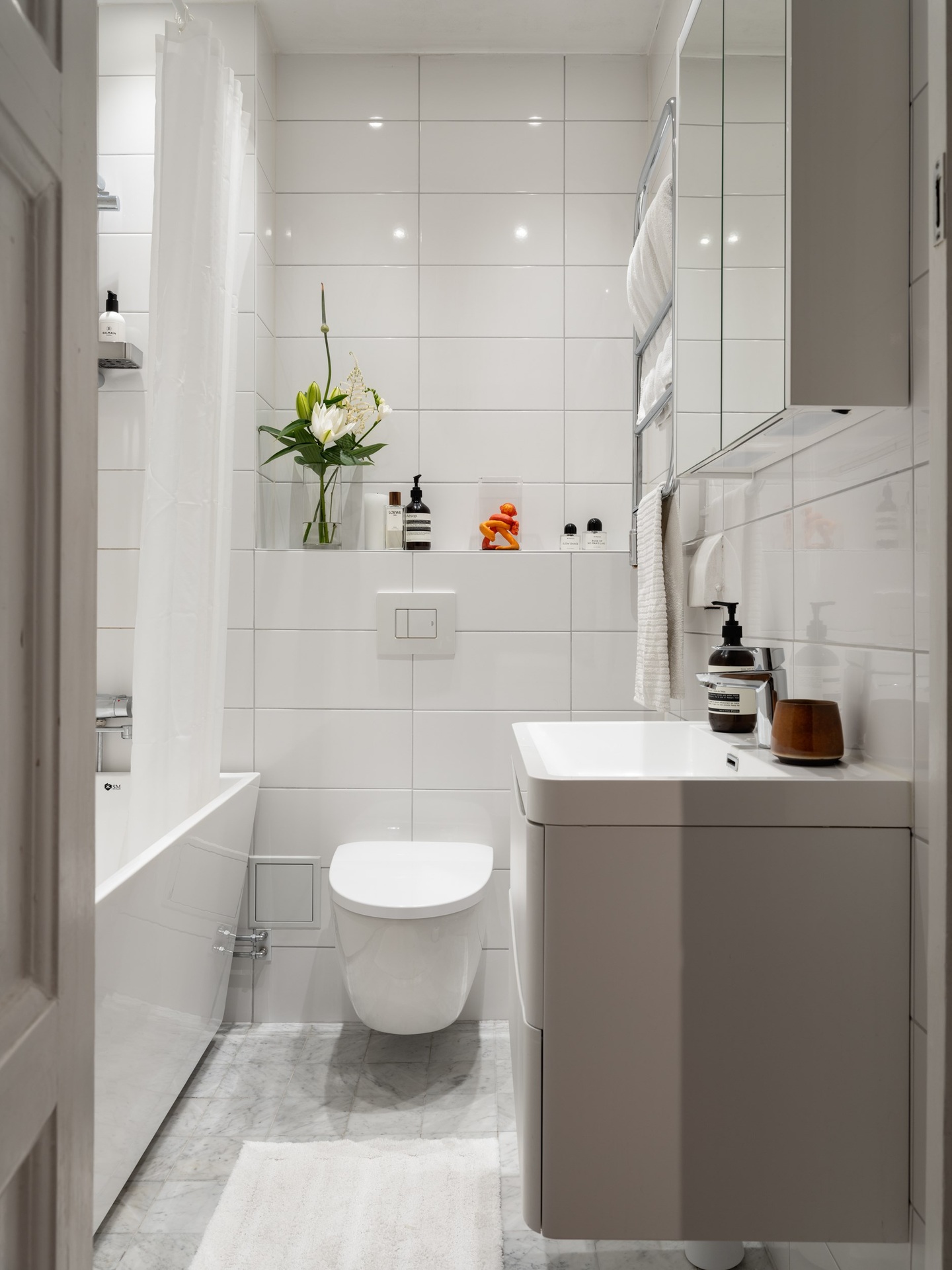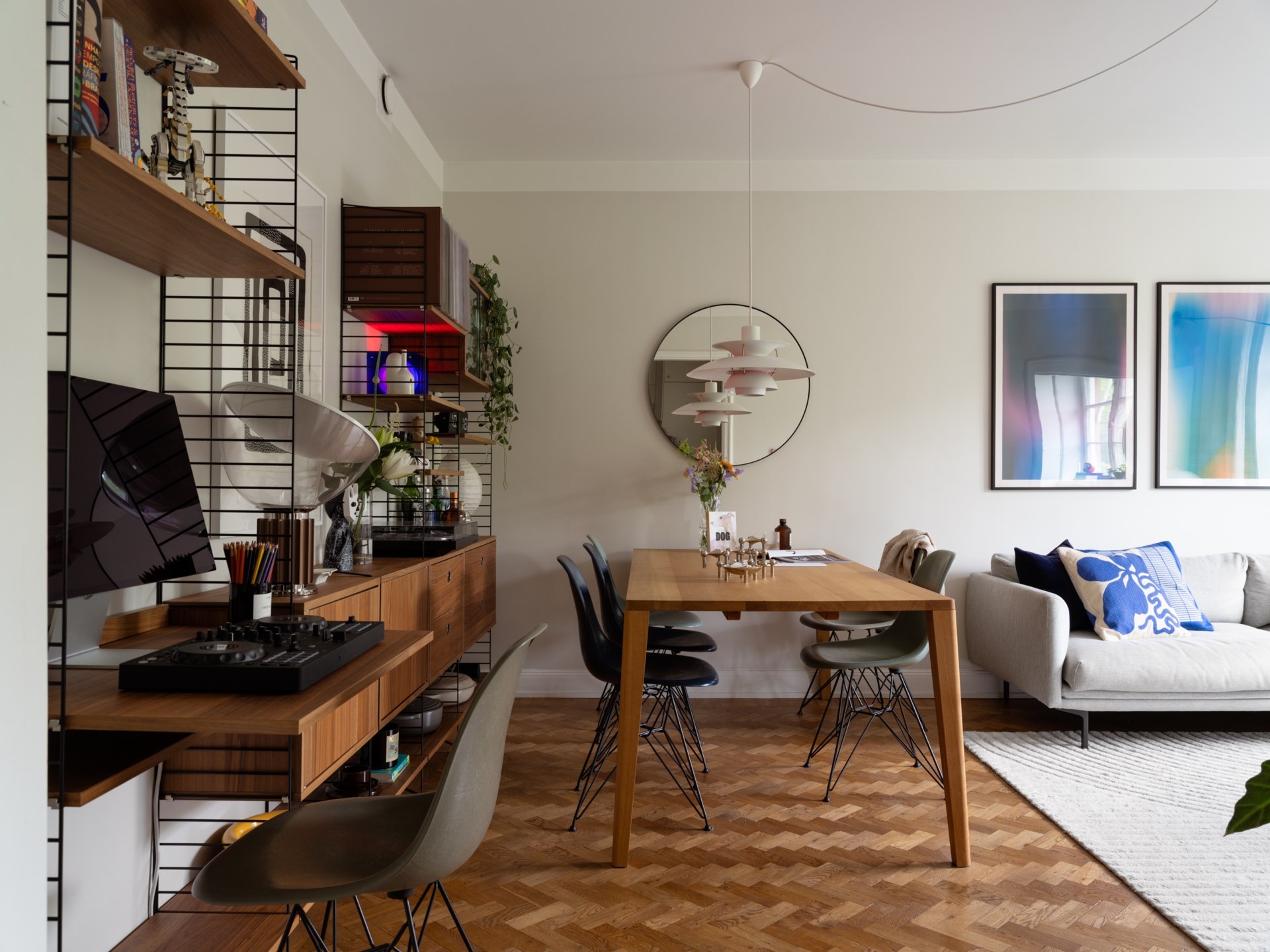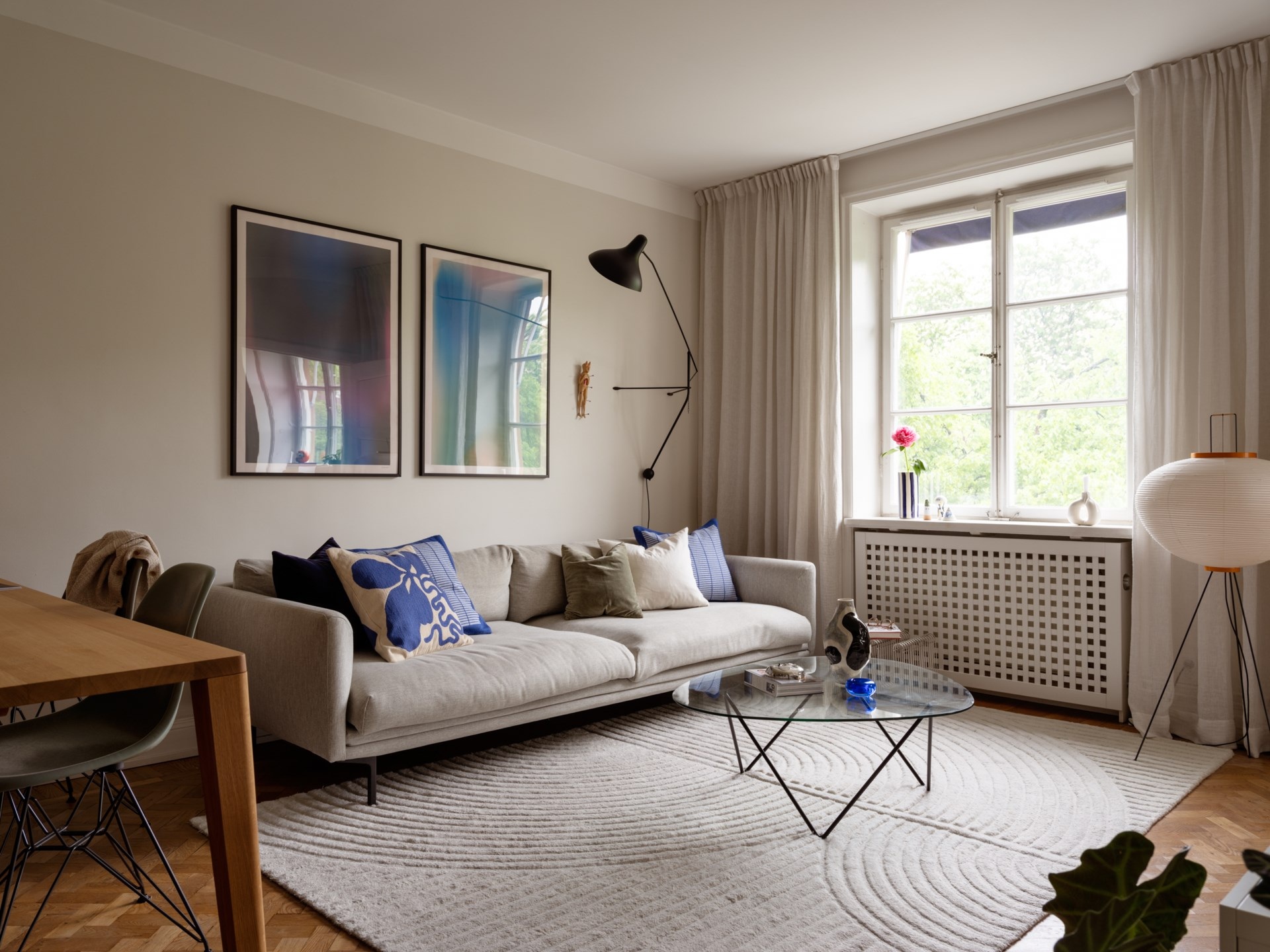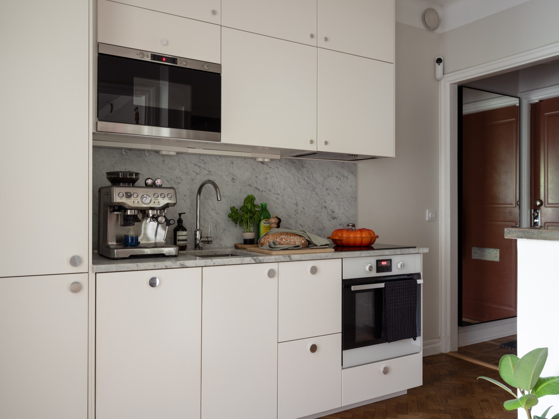 Egy 1920-as évekbeli épületében található ez a 43 m²-es, egy hálószobás lakás, amely a korszak történelmi karakterét ötvözi a kifinomult részletekkel. A mélyen ülő ablakokon beáradó fény a halszálkás parkettán ragyog, míg a magas mennyezetek tágasságot sugallnak. A korábbi előszobából praktikus konyha lett, így a nappaliban elég hely jutott egy étkezőnek és egy stílusosan kialakított dolgozóegységnek is. Az 50–60-as évek hangulatát idéző berendezéshez fehér konyhabútor és márványhatású munkalap társul, kék színfoltokkal.